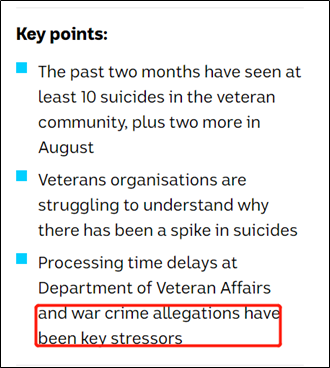 縱觀全文,除了2名受訪者的講述,這篇報(bào)道甚至無法提供一個(gè)切實(shí)的證據(jù),能證明澳軍自殺問題和戰(zhàn)爭罪行相關(guān)調(diào)查的關(guān)系,但在文章開頭,報(bào)道作者卻直接將調(diào)查稱為澳軍自殺的“主要壓力源”。