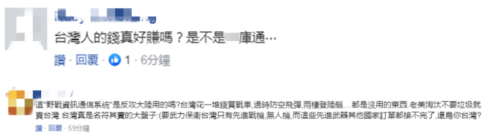 也有網(wǎng)友稱,“野戰(zhàn)通訊?臺灣想去大陸打叢林戰(zhàn)嗎?臺灣需要嗎?美帝想賣你什么,即使是垃圾,臺灣就得接受嗎?”“您說對了,這是一套我們不需要,也用不到的系統(tǒng),因?yàn)榕_灣只有西半部是開放空間,較不易受地形影響,其他根本無法用。”