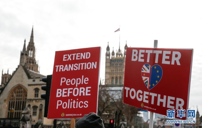 12月9日,反對“脫歐”的示威者手舉標(biāo)語牌站在英國倫敦議會大廈外。