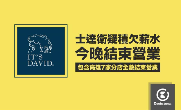 “士達(dá)衛(wèi)IT'S DAVID”倒閉消息。(圖/取自臉書粉絲專頁(yè)“高雄點(diǎn) Kaohsiung.”)圖片來(lái)源:臺(tái)灣《中時(shí)電子報(bào)》