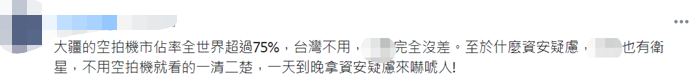 還有網(wǎng)友說,大疆的空拍機(jī)市占率全世界超過75%,臺(tái)灣不用,大陸完全沒差。至于什么資安疑慮,大陸也有衛(wèi)星,不用空拍機(jī)就看得一清二楚,“一天到晚拿資安疑慮來嚇唬人!”↓
