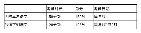 臺(tái)灣大學(xué)學(xué)科能力測(cè)驗(yàn)國(guó)文科考試(以下簡(jiǎn)稱“臺(tái)灣學(xué)測(cè)國(guó)文”)與大陸普通高等學(xué)校全國(guó)統(tǒng)一考試語文科目(以下簡(jiǎn)稱“大陸高考語文”)相比,首先是總分和考試時(shí)長(zhǎng)存在差異。