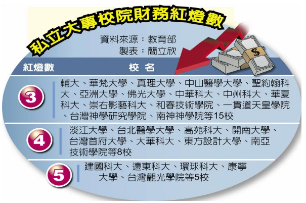 據(jù)臺灣教育部門“大專校院校務(wù)信息公開平臺”的私立學(xué)校財務(wù)比率及燈號欄,2018學(xué)年度營運能力3指標(biāo)(學(xué)雜費收入變動率、現(xiàn)金余絀變動率、本期余絀比率)、償債能力3指標(biāo)(現(xiàn)金流量比率、速動比率、可用資金比率)及財務(wù)結(jié)構(gòu)(負(fù)債權(quán)益比率),總計7項財務(wù)指標(biāo),紅燈意味最差的1/5。114所私校有15校拿到3個紅燈、8校拿到4個紅燈、5校拿到5個紅燈,輔大、淡江、中山醫(yī)學(xué)大學(xué)、臺北醫(yī)學(xué)大學(xué)赫然在列。