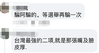 還有網(wǎng)友稱 “臺灣最強的兩項,就是那張嘴及臉皮厚。"民進黨慣會"騙啊騙,等選舉再騙一次。"