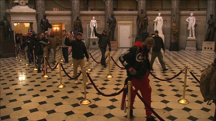當(dāng)?shù)貢r(shí)間1月6日,美國(guó)參眾兩院確認(rèn)選舉人團(tuán)投票結(jié)果的聯(lián)席會(huì)議,因現(xiàn)任總統(tǒng)特朗普支持者闖入國(guó)會(huì)大廈引發(fā)大規(guī)模騷亂而被迫中斷,現(xiàn)場(chǎng)極度混亂。圖為特朗普支持者在國(guó)會(huì)大廈內(nèi)抗議。