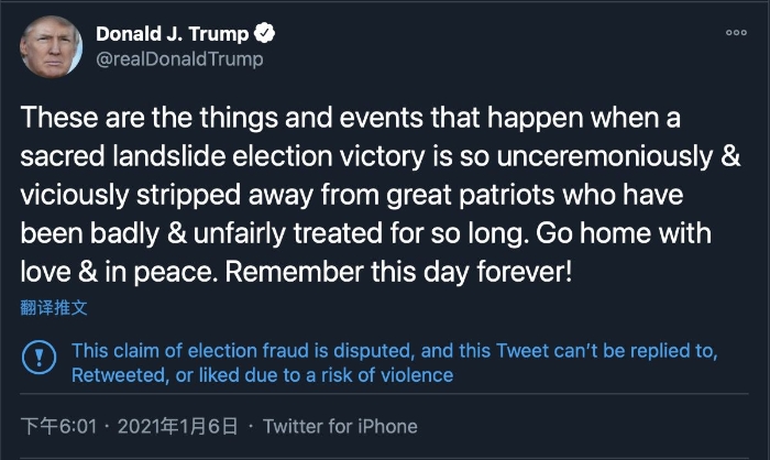 特朗普說(shuō):“這些都是當(dāng)神圣的壓倒性選舉勝利(指特朗普認(rèn)為自己在總統(tǒng)大選中獲勝),被毫不客氣地、惡毒地從偉大的愛(ài)國(guó)者手中剝奪時(shí)發(fā)生的事。他們已經(jīng)被長(zhǎng)時(shí)間不公正地對(duì)待了。大家要充滿(mǎn)愛(ài)與和平地回家。請(qǐng)永遠(yuǎn)記住這一天!”