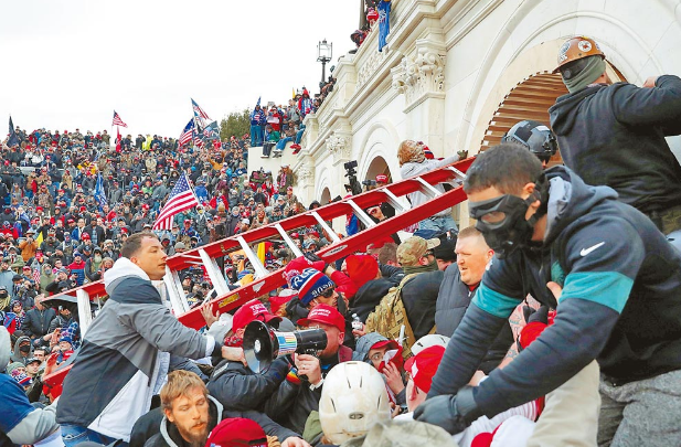 美國參眾兩院昨認(rèn)證拜登當(dāng)選新總統(tǒng)之際,川粉聚集國會(huì)山莊抗議并攻進(jìn)議事廳,釀流血暴力事件。圖為川粉群聚攻進(jìn)山莊。(圖片來源:路透社)