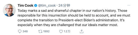 蘋果公司CEO蒂姆·庫克發(fā)布推文譴責(zé)特朗普支持者暴力攻占了美國國會(huì)大廈的暴力事件,認(rèn)為這是美國歷史上的一個(gè)悲哀、可恥的篇章。