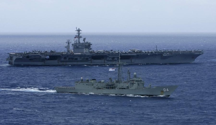 這是2012年7月18日,在美國夏威夷瓦胡島以北海域,參加“環(huán)太平洋”軍演的一艘澳大利亞海軍艦只(前)和美國海軍“尼米茲”號航母一同航行的資料照片。新華社/路透