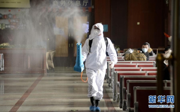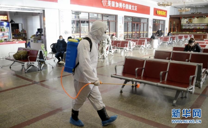 1月12日,北京站防疫人員對(duì)候車室進(jìn)行每4小時(shí)一次的防疫消殺。