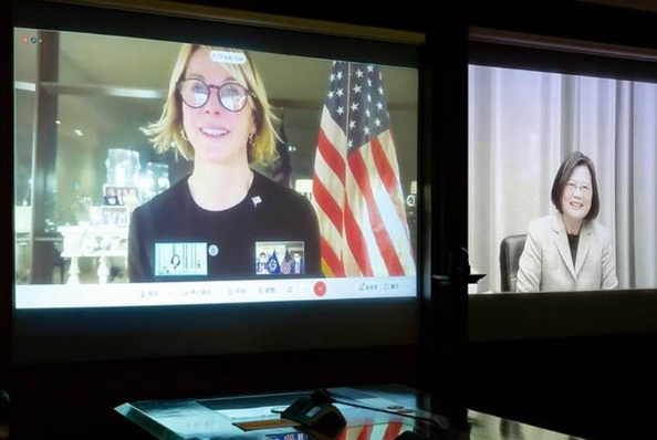 美國駐聯(lián)合國大使克拉夫特與臺(tái)當(dāng)局領(lǐng)導(dǎo)人蔡英文視頻對(duì)話。圖片來源:臺(tái)灣《中時(shí)電子報(bào)》