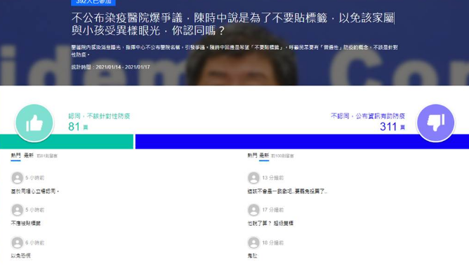 《Yahoo奇摩》14日就對此發(fā)起網(wǎng)絡投票民調(diào),以“不公布染疫醫(yī)院爆爭議,陳時中稱是為了不要貼標簽,呼吁民眾要有普遍性防疫的概念,以免該家屬與小孩受異樣眼光,你認同嗎?”為題詢問廣大網(wǎng)友看法,投票時間為1月14日至17日,截至14日晚間5時40分為止,共有近400名網(wǎng)友投票,投“不認同,公布信息有助防疫”的人有308票,比例占79.6 %,投“沒影響”的票數(shù)為81票,比例占21.4%。