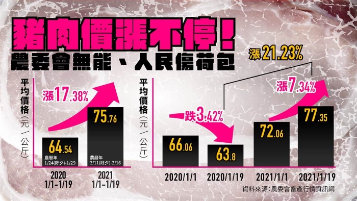 國民黨文傳會主委王育敏說,根據(jù)“農(nóng)委會”畜產(chǎn)行情信息網(wǎng)數(shù)據(jù),今年元旦起開放萊豬進口后,臺灣豬肉價格顯著上揚。1月19日全臺豬肉平均價格為每公斤77.35元(新臺幣,下同),較去年1月19日的63.8元高漲21.23%,也較今年1月1日的72.06元上漲7.34%。若以今年1月份(統(tǒng)計至19日止)來看,全臺豬肉平均價格每公斤75.76元,相較于去年同期的64.54元,漲幅高達17.38%,增加每個家庭不少的負擔。