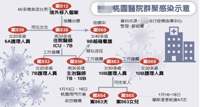 臺灣桃園醫(yī)院群聚感染示意。圖片來源:臺灣《中國時報》