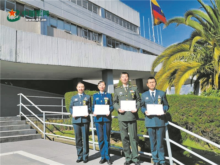 “中國專家在厄瓜多爾工作期間,正值當(dāng)?shù)乜箵粜鹿诜窝滓咔榈奶厥鈺r(shí)期,他們冒著生命危險(xiǎn)奮戰(zhàn)在抗疫第一線,彰顯出非凡的敬業(yè)精神和專業(yè)素養(yǎng),為增進(jìn)厄中兩國、兩軍的友好往來作出了重要貢獻(xiàn)?!?月16日,厄瓜多爾陸軍司令部在位于厄首都基多的陸軍戰(zhàn)爭學(xué)院舉行授勛儀式,授予中國人民解放軍第15批援厄軍醫(yī)專家組廖俊寧、周彬、張輝和劉歡等4名成員“武裝力量之星”榮譽(yù)勛章,以此表彰他們?cè)诙蚬ぷ髌陂g為鞏固兩國、兩軍友誼,以及為提高厄醫(yī)療水平和培訓(xùn)厄醫(yī)務(wù)人員作出的重要貢獻(xiàn)。