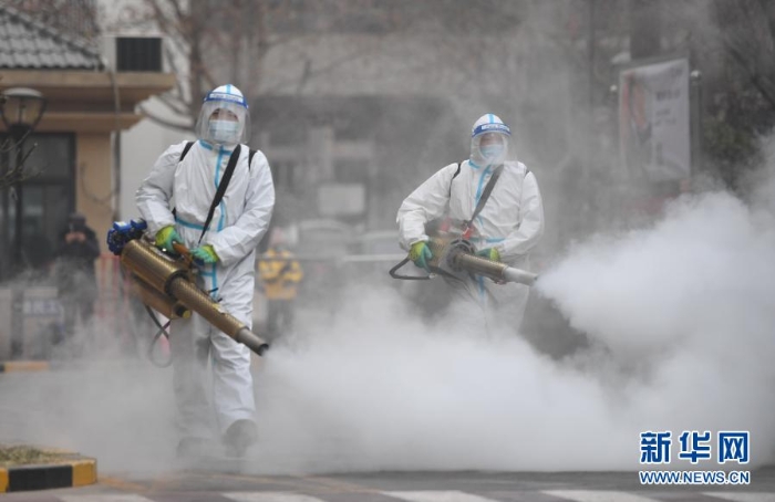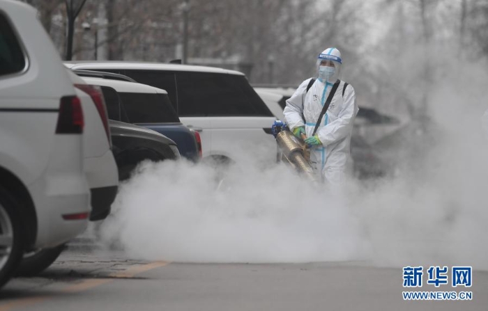 1月24日,工作人員在石家莊市裕華區(qū)藍郡名邸小區(qū)開展消殺作業(yè)。