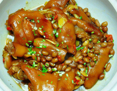 鹵,采用多種中藥材、醬油、米酒等調(diào)料長時間燉煮,是臺灣特有烹調(diào)技法。顧名思義,將花生、豬腳、醬油及特配中藥材以小火慢燉,長時間燉煮后皮肉香滑且富有彈性,花生吸取燉煮精華香而入味,具養(yǎng)顏美容功效。