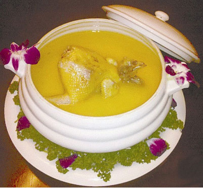 王勃的《滕王閣序》不但為名閣生輝,贛地增色。而且?guī)С隽艘坏澜髅耍汉槎茧u?!昂槎茧u”的故事主要流傳于盛產(chǎn)蜜桔的撫州南豐一帶。當(dāng)年洪州都督閻公在滕王閣設(shè)宴,請來數(shù)位名廚做菜,其中有一位南豐的名師。名師本想獻上蜜桔表示對王勃的敬意。無奈蜜桔還未上市,遺憾之時,忽見掛在灶間的一串桔黃的南豐桔干皮,將其泡軟切絲,并配入雞中一起烹制。當(dāng)菜做好端上桌時,美味散發(fā),滿屋桔香,閻公請王勃和眾賓客品嘗。大家無不稱譽此雞特有的色、香、味、氣。王勃便給此菜名取名為‘洪都雞’”。