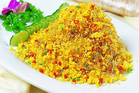 金毛獅子魚:石家莊傳統(tǒng)名菜。這道菜以鯉魚為主要材料,經(jīng)加工修飾后炸制而成。菜品酸甜適口、色澤金黃、魚絲蓬松形似獅子,故得名“金毛獅子魚”。此菜始于民國初期,由石家莊某飯店名廚創(chuàng)制。