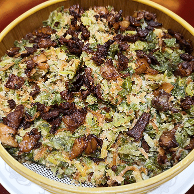 相傳,隋末唐國(guó)公李淵被貶太原留守,攜家眷途經(jīng)靈空山古剎盤(pán)谷寺,老方丈特制了這種莜面食品以款待。李淵問(wèn):“手端何物?”老方丈答:“栲栳栳”。栲是植物的泛稱(chēng),栲栳指用竹篾或柳條編成的盛物器具(《辭?!罚?。唐寅有詩(shī)云:“琵琶寫(xiě)語(yǔ)番成怨,栲栳量金買(mǎi)斷春。”看來(lái)當(dāng)時(shí)方丈是以手端的小籠屜作答了。后來(lái)李淵當(dāng)了皇帝,便派老方丈到五臺(tái)山當(dāng)住持。老方丈帶領(lǐng)眾僧赴任,路過(guò)靜樂(lè)縣,看莜麥初收,便把莜面栲栳栳制法傳給當(dāng)?shù)亍?/p>