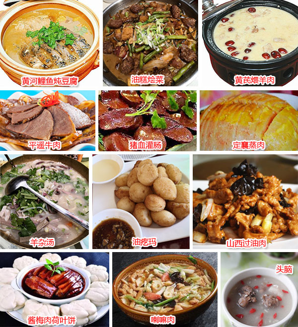 晉菜中的傳統(tǒng)名菜有糖醋魚(yú)、鍋燒羊肉、蔥爆柏籽羊肉、拔絲山藥、鐵碗烤蛋、腐乳肉、山西過(guò)油肉、醬梅肉荷葉餅、老大同什錦火、香酥雞、黃芪煨羊肉、酸湯羊肉、烤羊排/烤羊脊、糖醋鯉魚(yú)、黃河鯉魚(yú)燉豆腐、驢肉鼎鼎香、罐燜鹿肉、鵪鶉茄子、蜜汁開(kāi)口笑、涼粉炒饃、晉城十大碗、高平十大碗、巴公燒大蔥、陽(yáng)城燒肝、高平燒豆腐、陵川黨參燉土雞、晉味焗南瓜、鐵板土豆泥、地皮菜燴絲絲、蒲棒長(zhǎng)山藥、晉南四味、油潑黃河大鯉魚(yú)、黃酒燜肉、西紅柿燴莜面魚(yú)魚(yú)、紅薯琥珀肉、太谷熏鴿、平遙牛肉、定襄蒸肉、晉中壓花肉等。