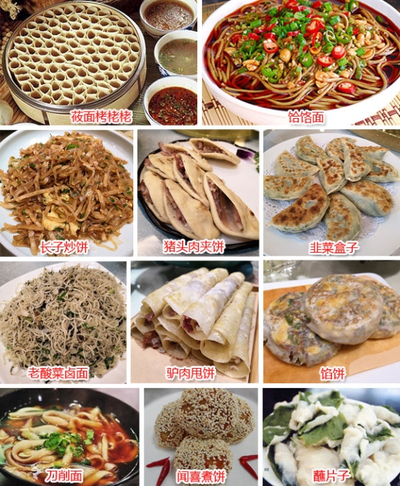 山西面食尤其著名,品種多,吃法別致,風(fēng)味各異,如刀削面、饸饹面、剪刀面、拉面、長(zhǎng)子炒餅、山西燜面、清徐蘸片子、莜面栲栳栳、燒麥、發(fā)糕、晉南饃、山藥抿面、豆面抿面等等。