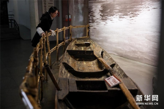 1月26日,李若雪在遵義會(huì)議陳列館內(nèi)查看自己參加工作后接手維護(hù)的第一件文物——紅軍南渡烏江時(shí)使用的木船。新華社記者 歐東衢攝