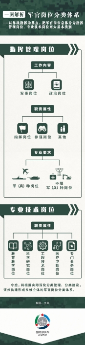 指揮管理崗位按照工作內(nèi)容,分為軍事崗位、政治崗位,這是基于我軍根本性質(zhì)、根本宗旨和“軍政雙首長制”等制度安排劃分的,充分貫徹和體現(xiàn)了黨對人民軍隊的絕對領(lǐng)導(dǎo)的根本原則和制度;按照職責(zé)屬性,分為指揮崗位、參謀崗位等,這是依據(jù)不同崗位在作戰(zhàn)行動和部隊建設(shè)中的地位作用和職責(zé)任務(wù)劃分的;按照專業(yè)要求,分為軍種(兵種)崗位、不限軍種(兵種)崗位,這是依據(jù)崗位履職所需的專業(yè)知識、經(jīng)歷和經(jīng)驗劃分的。