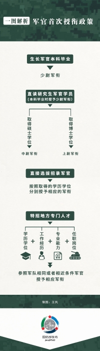 吳謙:此次軍官制度改革,調(diào)整了軍官首次授銜政策。主要變化是,生長軍官本科畢業(yè)的授予少尉軍銜;對直讀研究生軍官學(xué)員,本科畢業(yè)時授予少尉軍銜,研究生畢業(yè)取得碩士、博士學(xué)位的,分別晉升為中尉、上尉軍銜;對直接選拔招錄的軍官,按照取得的學(xué)歷學(xué)位,分別授予相應(yīng)的軍銜;對特招地方專門人才擔(dān)任軍官的,綜合衡量其學(xué)歷學(xué)位、工作經(jīng)歷、專業(yè)能力和任職崗位等因素,參照軍隊相同或者相近條件軍官,授予相應(yīng)的軍銜。