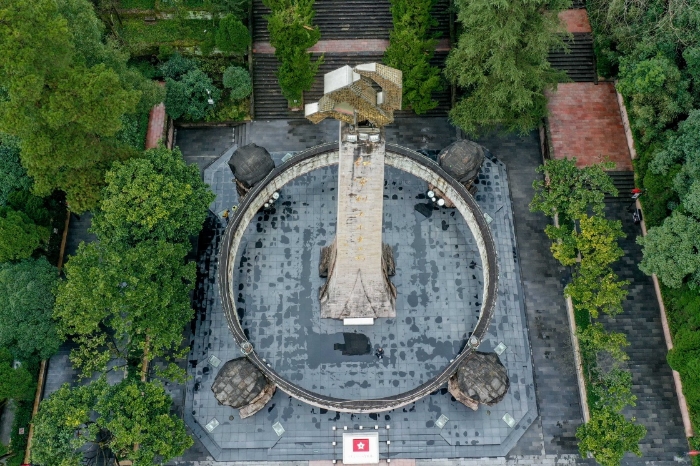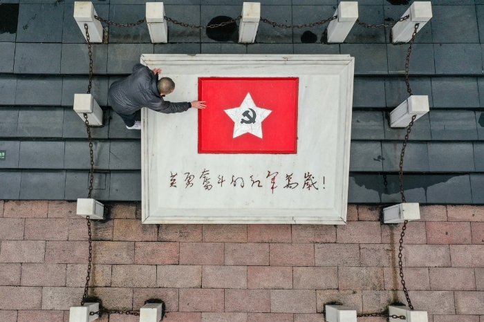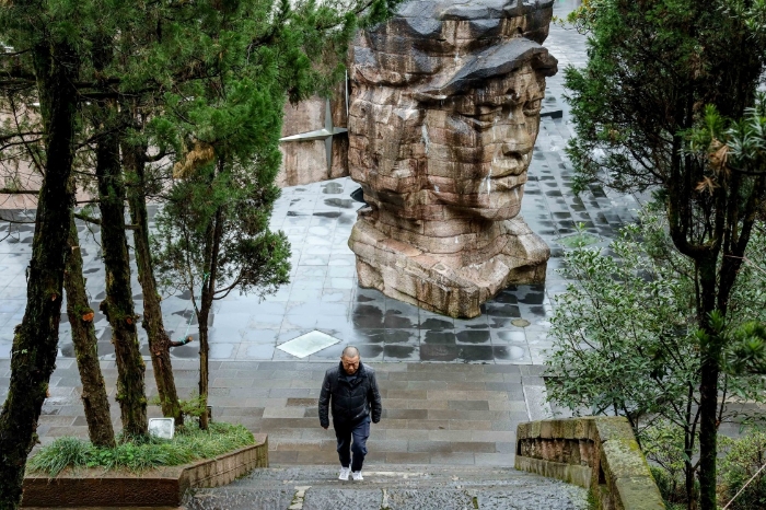 1月25日,楊愛民在遵義紅軍烈士陵園內(nèi)清潔雕塑(無人機照片)。新華社記者 歐東衢 攝