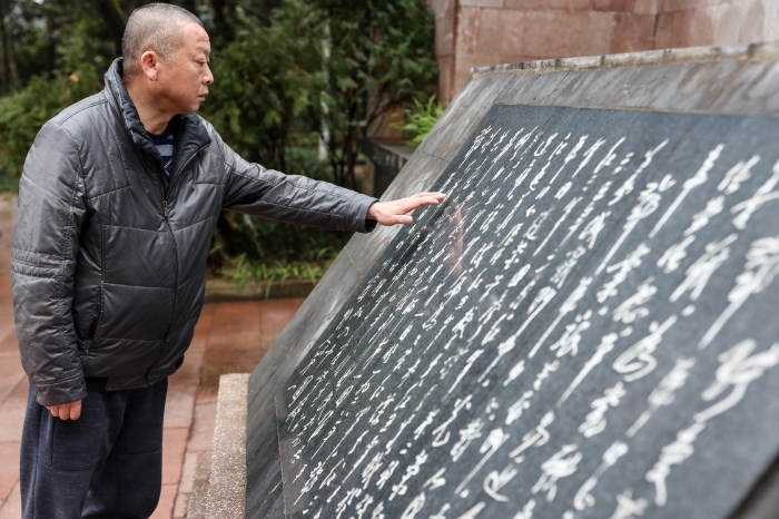 1月25日,楊愛民在遵義紅軍烈士陵園內(nèi)的鄧萍同志墓前檢查石碑老化情況。新華社記者 歐東衢 攝