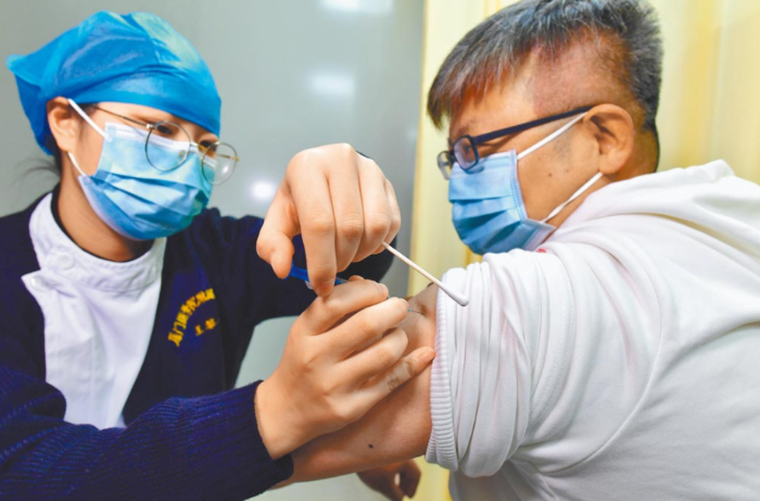 福建廈門醫(yī)學院附屬第二醫(yī)院,醫(yī)護人員正在為一位臺胞接種新冠疫苗。(圖源:中新社)