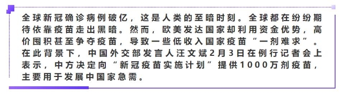 汪文斌宣布,應(yīng)世衛(wèi)組織方面請求,中方?jīng)Q定向“實施計劃”提供1000萬劑疫苗,主要用于發(fā)展中國家急需。這是中方促進疫苗公平分配、推進國際抗疫合作、踐行人類衛(wèi)生健康共同體理念的又一重要舉措。