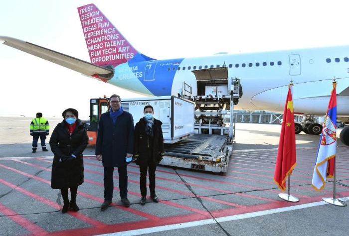 1月16日,在塞爾維亞首都貝爾格萊德,塞爾維亞總統(tǒng)武契奇(前排中)在機場迎接首批中國新冠疫苗。