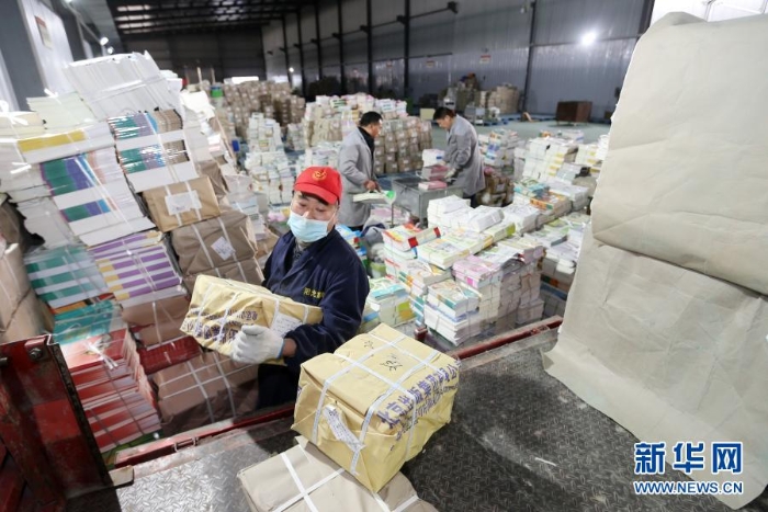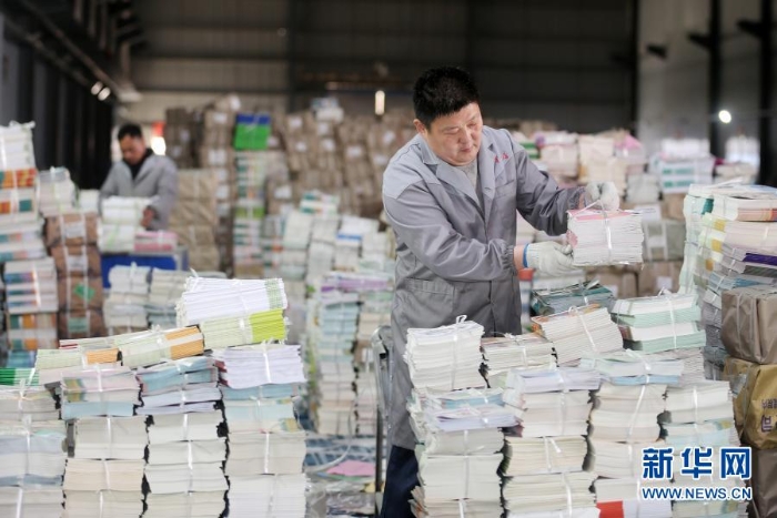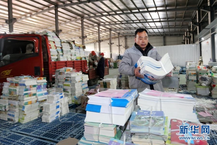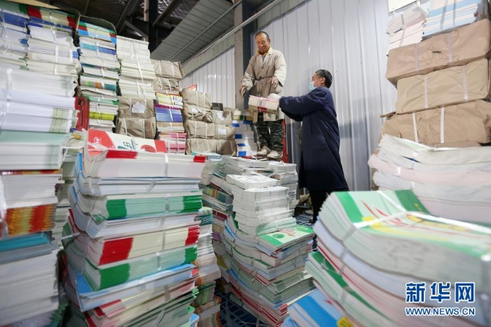 2月18日,在安徽省淮北市新華書店教材倉(cāng)庫(kù)內(nèi),工作人員在分類整理新學(xué)期教材。