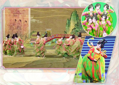 “鬢云欲度香腮雪,衣香袂影是盛唐。”春節(jié)期間,一群嬌憨靈動(dòng)、活潑可愛的“唐朝小胖妞”憑借一支古典舞火遍網(wǎng)絡(luò)。在由鄭州歌舞劇院創(chuàng)排的《唐宮夜宴》中,她們走出《搗練圖》《簪花仕女圖》的古老畫卷,穿梭在婦好鸮尊、蓮鶴方壺、賈湖骨笛等國寶文物之間,把大唐風(fēng)華融于少女的一顰一笑中,時(shí)而雍容嫻雅,時(shí)而天真爛漫,為觀眾呈現(xiàn)出一個(gè)中國版的“博物館奇妙夜”。國寶、國風(fēng)與國潮同頻共振,激蕩出濃濃的煙火氣,生動(dòng)展示了大氣磅礴的盛世文化。