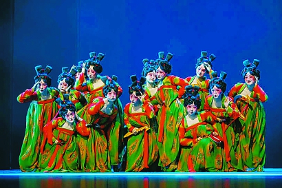 《唐宮夜宴》由鄭州歌舞劇院的14位女演員表演,靈感來源于河南博物館的一組唐三彩樂俑。為了演活豐腴的唐代侍女,她們穿上了塞著海綿的連體衣,嘴里含著特制棉花。眼角畫上兩道月牙,那是唐代潮流面飾“斜紅”。繁復(fù)的發(fā)飾加上唐三彩色樣的紗衣,“鬢云欲度香腮雪,衣香袂影是盛唐”出現(xiàn)在眼前。