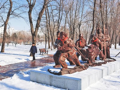 遼寧丹東鴨綠江畔,志愿軍公園雕塑《支援》。本報(bào)記者 劉勇攝/光明圖片