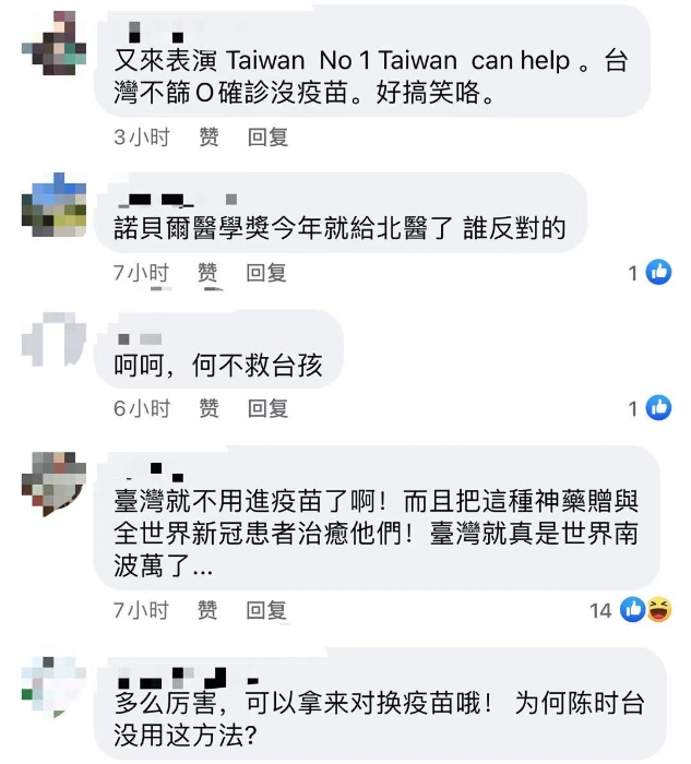 對此,臉書專頁“靠北民進(jìn)黨”轉(zhuǎn)發(fā)此則新聞并帶上tag“還買疫苗干嘛”、“是啥神奇的藥,還不拿出來給臺灣民眾使用”、“義和團(tuán)海外擴(kuò)編了”,表示民進(jìn)黨當(dāng)局的大內(nèi)宣功力讓全世界自愧不如!