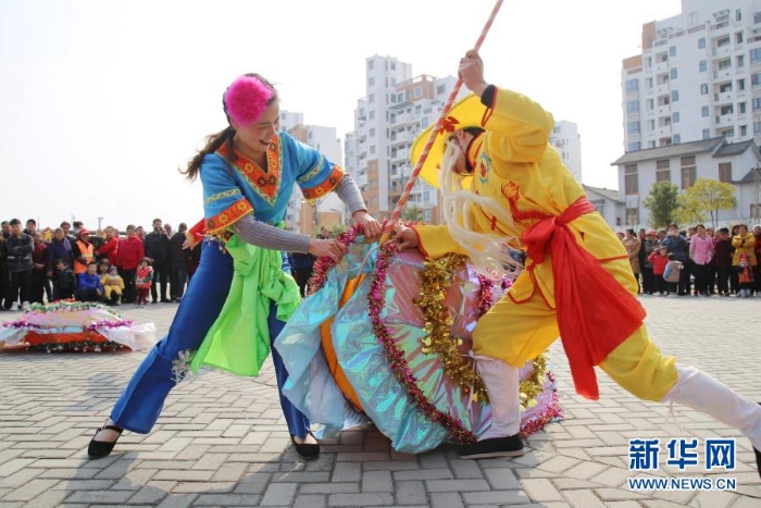 2月23日,在湖北省十堰市鄖陽區(qū)柳陂鎮(zhèn)龍韻村,民間藝人在表演“漁翁戲蚌”。