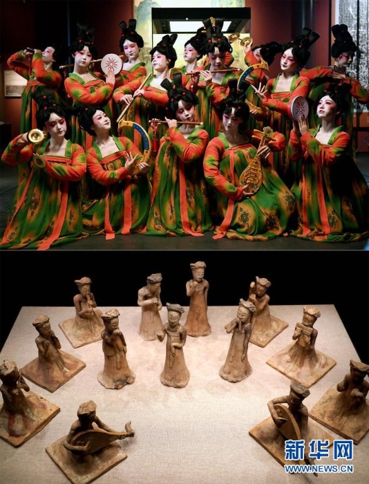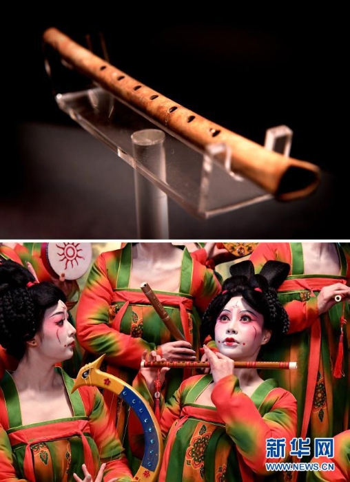 拼版照片:上圖為河南博物院展出的“賈湖骨笛”(2019年11月18日攝);下圖為鄭州歌舞劇院的演員在河南博物院錄制元宵奇妙夜節(jié)目(2月20日攝)。新華社記者 李安 攝