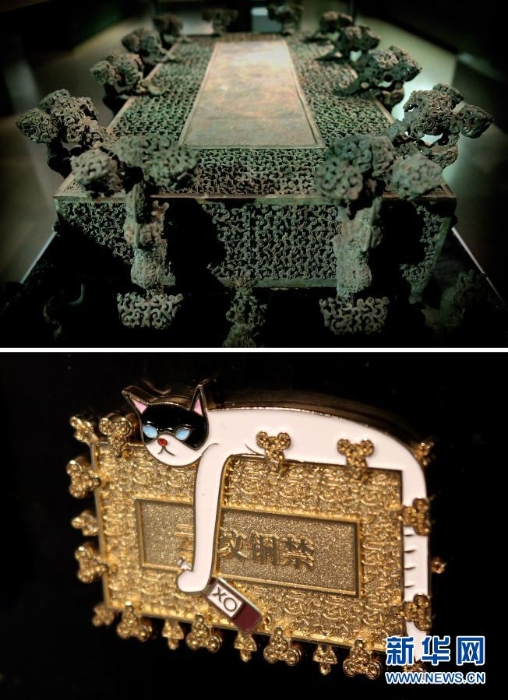拼版照片:上圖為2019年11月18日拍攝的河南博物院展出的“云紋銅禁”(新華社記者李安攝);下圖為河南博物院推出的“云紋銅禁”文創(chuàng)產(chǎn)品(資料照片)。新華社發(fā)