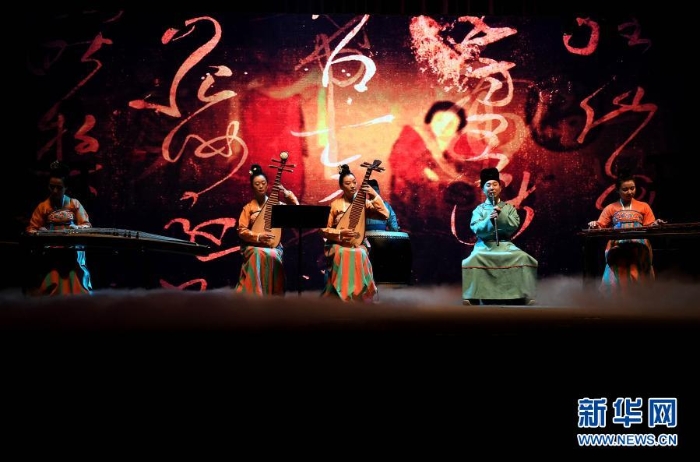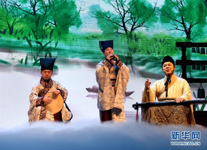 河南博物院華夏古樂(lè)團(tuán)的演員們?cè)跒橛^眾演奏(2020年1月1日攝)。新華社記者 李安 攝