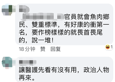此外,還有網(wǎng)友譏諷民進(jìn)黨當(dāng)局官員真只會魚肉鄉(xiāng)民、雙重標(biāo)準(zhǔn),有好的就沖第一名,要做榜樣的就畏首畏尾。更有網(wǎng)友直指民進(jìn)黨所謂優(yōu)先醫(yī)護(hù)實(shí)則是“讓醫(yī)護(hù)先看有沒有用,政治人物再來。”