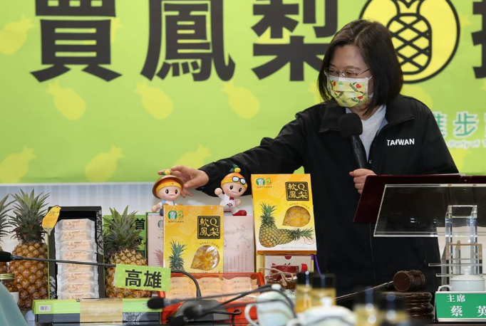 民進(jìn)黨3日舉行“買菠蘿 挺農(nóng)民”記者會(huì),黨主席蔡英文(中)率嘉義縣長翁章梁(右五起至左)、臺(tái)南市長黃偉哲、高雄市長陳其邁、屏東縣長潘孟安及中常委們,呼吁全民一起買菠蘿,挺農(nóng)民。(劉宗龍攝)圖片來源:臺(tái)灣《中國時(shí)報(bào)》