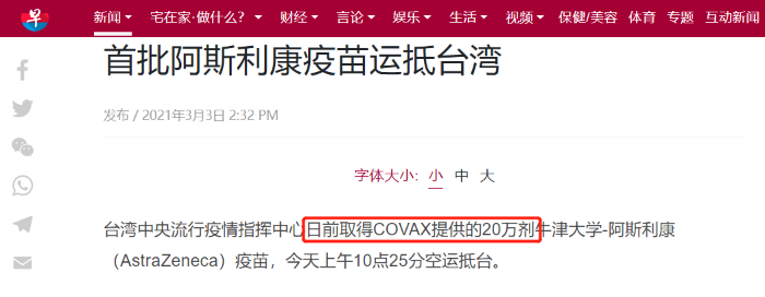 除了疫苗來(lái)源外,該消息的另一個(gè)爭(zhēng)議點(diǎn)則是首批抵臺(tái)疫苗的總數(shù)。新加坡《聯(lián)合早報(bào)》的報(bào)道中沿用了疫苗來(lái)自COVAX平臺(tái)的說(shuō)法,并表示這批疫苗的總劑量是20萬(wàn)劑,而不是臺(tái)灣“中央社”和RFI所寫(xiě)的11.7萬(wàn)劑。