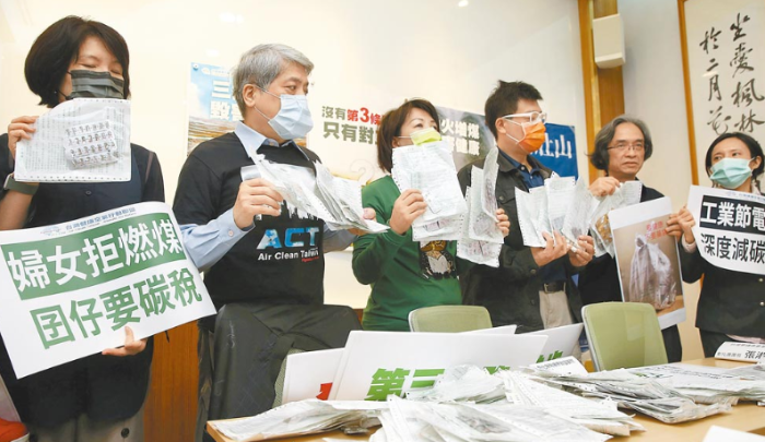 臺灣健康空氣行動聯(lián)盟8日召開記者會,呼吁臺經(jīng)濟部門提出第三條能源轉(zhuǎn)型道路,而非逼迫人民在健康、藻礁之中二選一。(王英豪攝)圖片來源:臺灣《中時電子報》