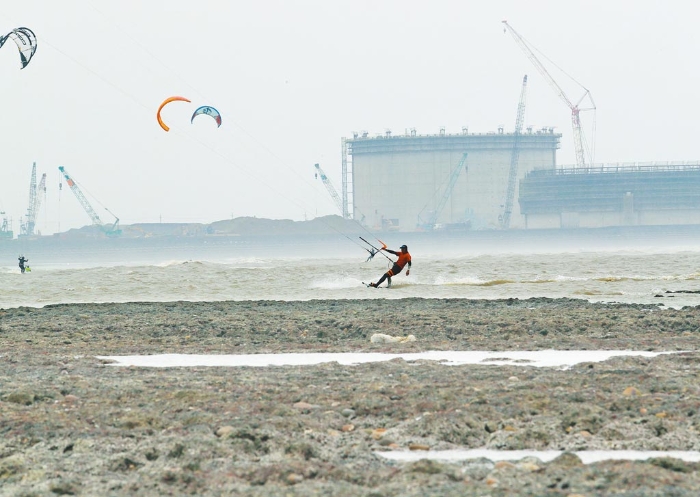 圖為興建中大潭天然氣儲(chǔ)存槽旁的新藻礁保護(hù)區(qū)水域,現(xiàn)成為風(fēng)箏沖浪愛(ài)好者沖浪的圣地。(陳怡誠(chéng)攝)