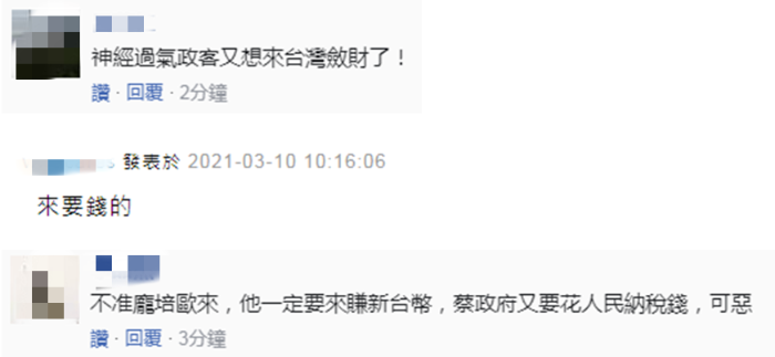 對于蓬佩奧的說辭,有島內(nèi)網(wǎng)友痛斥,“神經(jīng)過氣政客又想來臺灣斂財了!”“不準(zhǔn)蓬佩奧來,他一定要來賺新臺幣,蔡當(dāng)局又要花人民納稅錢,可惡?!?/p>