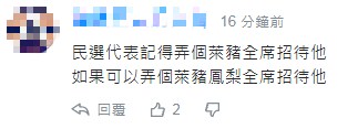 也有網(wǎng)友調(diào)侃,“民選代表記得弄個萊豬全席招待他,如果可以弄個萊豬鳳梨全席招待他。”
